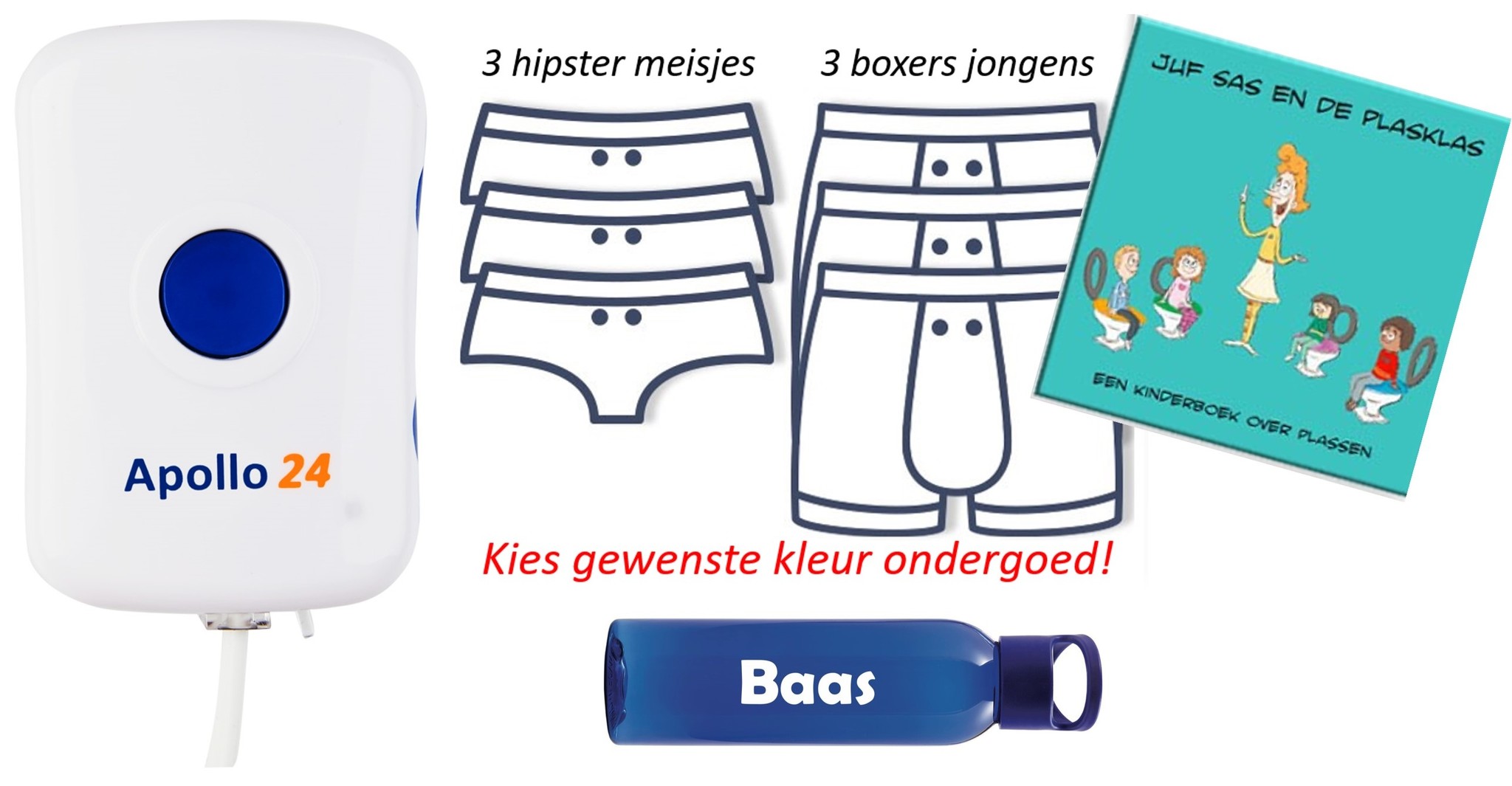 In this package, besides the Apollo 24 day alarm clock, a cord with 2 snaps and 3 pairs of sensor underwear are supplied. The cord with the snaps connects the Apollo 24 to the sensor panties. These sensor panties are the same panties that are also used for the bedwetting alarms against bedwetting.