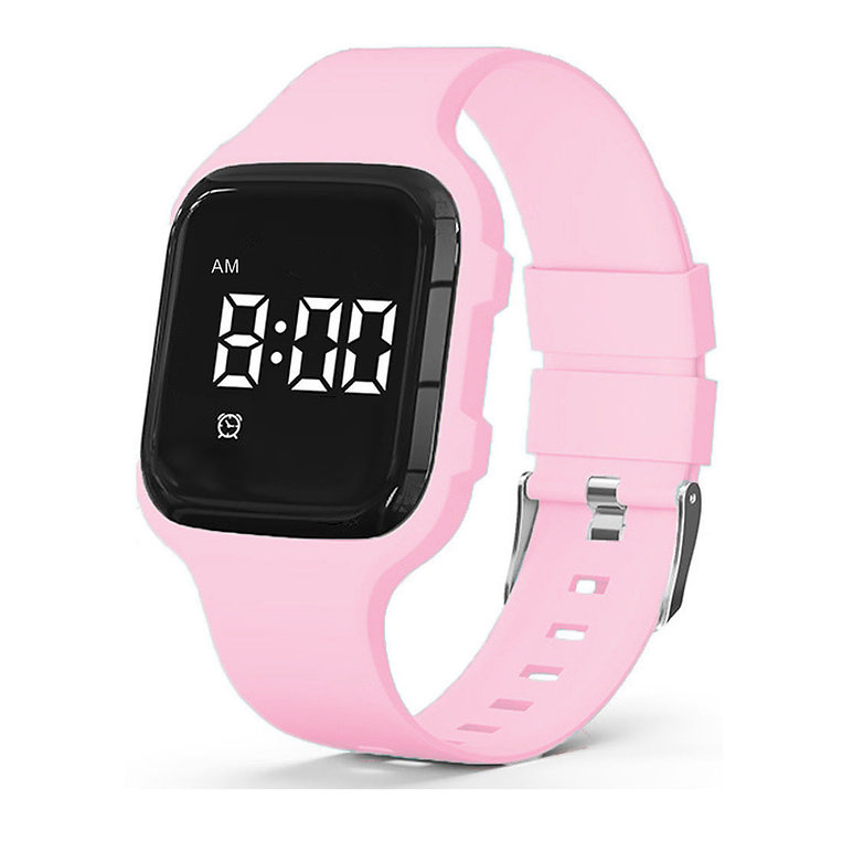 The watch is modern and hip and has a silicone strap. It contains no plasticizers. The band actually fits every wrist and is very pleasant to use. Even with thin wrists!