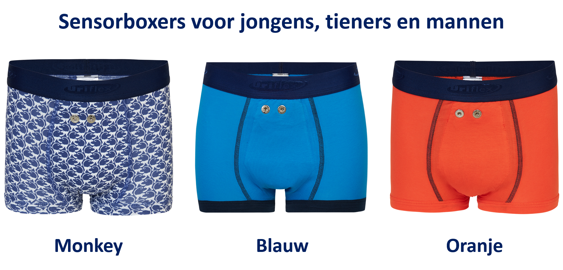 De met de hand gemaakte sensor onderbroeken voelen en zien eruit als normale onderbroeken, maar zijn voorzien van speciale sensordraden. Met deze sensordraden wordt een groot gebied “bewaakt” om het urineverlies snel te signaleren. Aangezien jongens en meisjes anders zijn gebouwd, hebben wij speciale sensorbroekjes voor jongens (boxers) en meisjes (hipsters). Per geslacht is er keuze uit 3 verschillende kleuren.